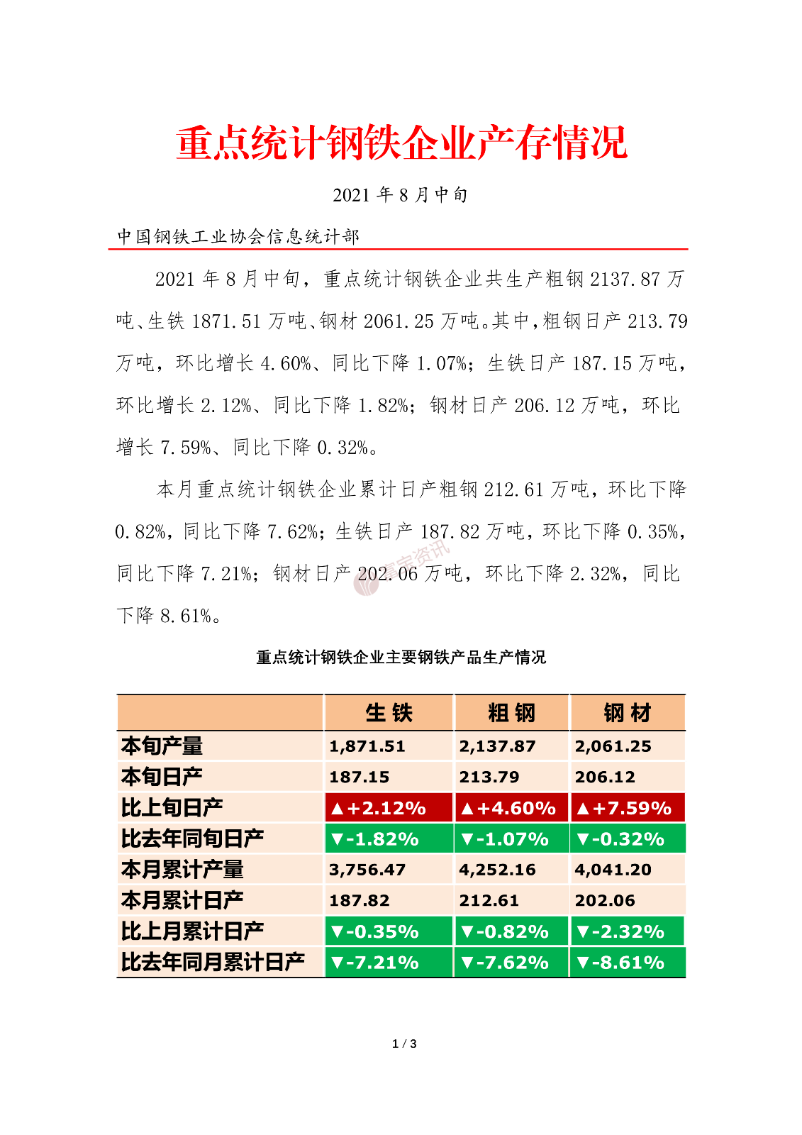 中钢协:8月中旬重点钢企粗钢日均产量213.79万吨