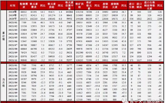据统计局数据,2021年1-11月,全国累积粗钢产量94636亿吨,累积同比减量2545万吨,累计降幅2.6%,基本上完成了全年压减粗钢产量的目标,如果分区域来看,华北地区省份已经超额完成任务,南方部分省份12月仍需继续推进减产。其中11月当月粗钢产量6931万吨,同比减量1943万吨,降幅高达22%。1-11月累积铁水产量79623万吨,同比减量1667万吨,累计降幅2.1%;11月当月铁水产量6173万吨,同比减量1028万吨,降幅14.3%。由粗钢和铁水产量估算的废钢添加量累计1.88亿吨,累计减量1000万吨,累计降幅5%;11月当月废钢添加量1021万吨,同比减量1021万吨,降幅50%,这主要是由于在政策性减产过程中钢企倾向于优先减少易于调节的废钢用量,同时也与废钢价格远高于铁水价格,废钢性价比降低有关。